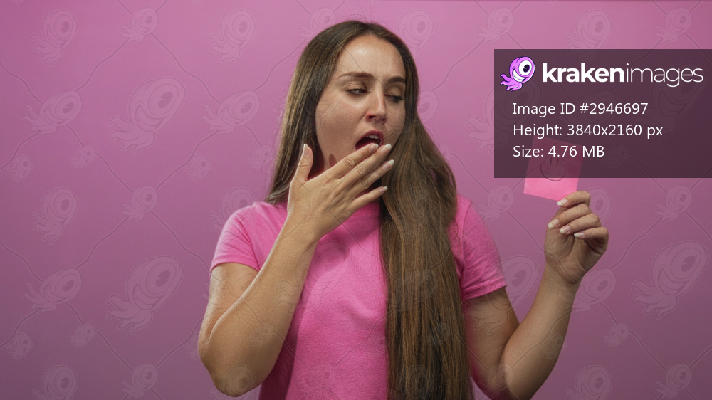 Woman yawning while holding a pink sticky note with smiley in a pink studio; boredom quiet reflection.