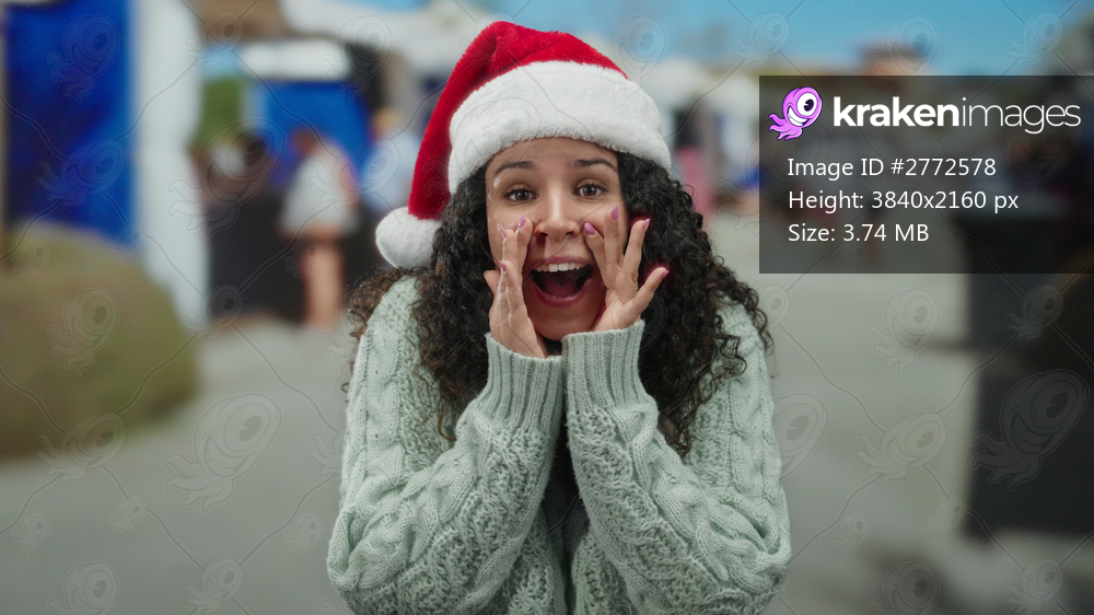 Woman yelling and smiling at street market wearing santa hat and green sweater with people in background during holiday season.