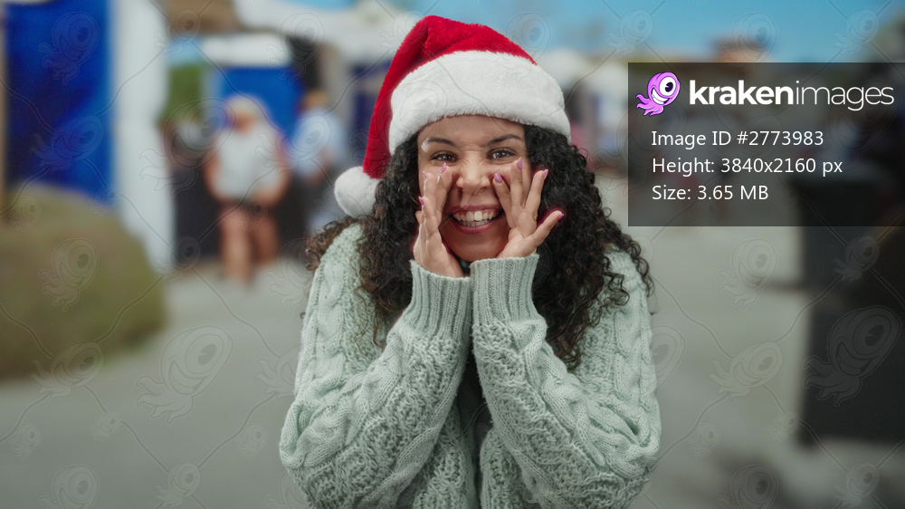 Woman yelling and smiling at street market wearing santa hat and green sweater with people in background during holiday season.