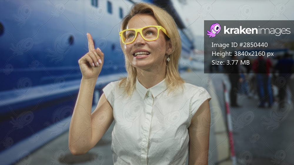 Woman with yellow glasses finger pointing to a blue boat on a crowded street pier; curiosity exploration.