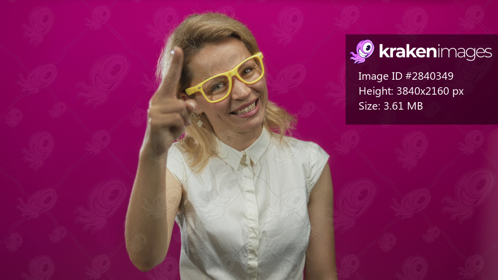 Woman with yellow glasses and finger to head for salute in studio with bright pink wall and white shirt; playfulness.