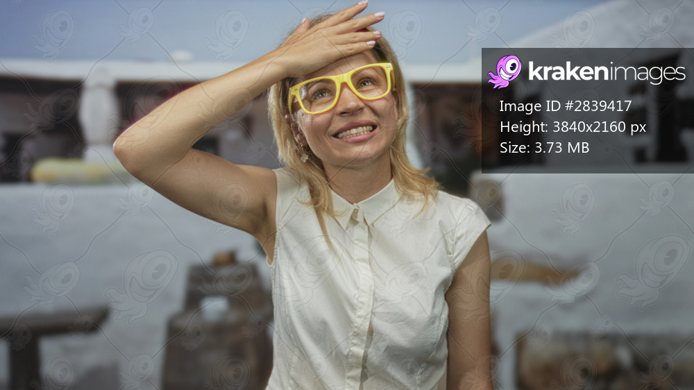 Woman with yellow glasses raises her hand to forehead at a white building entrance outdoors under bright sunlight; hope.