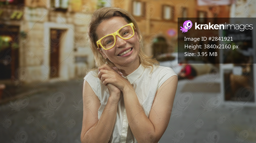 Woman with yellow glasses smiling and clasping hands on bustling city street in daylight; warm joy optimism.