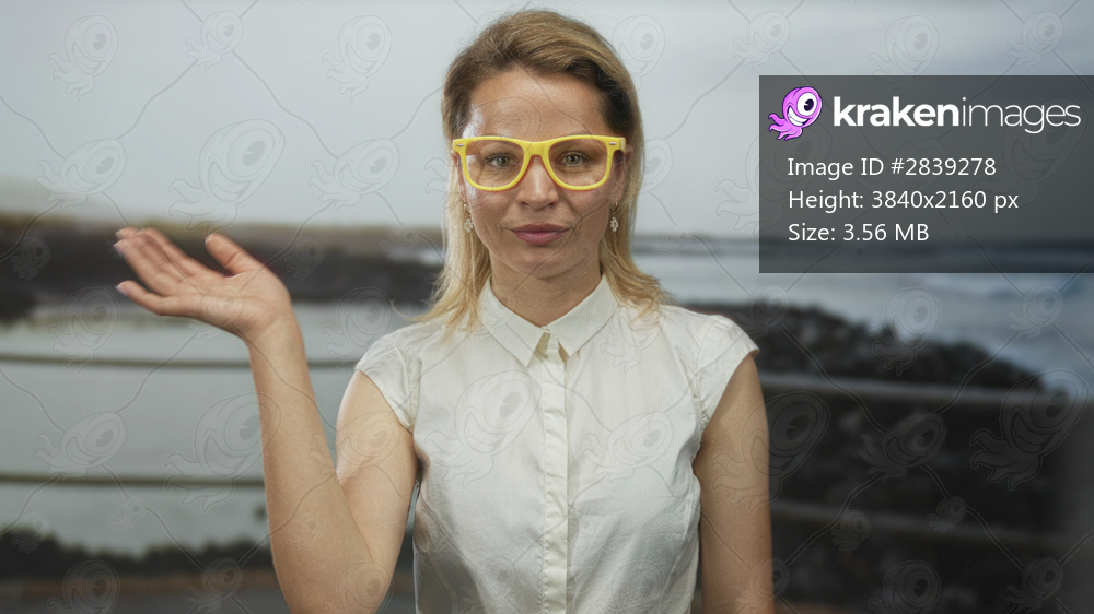 Woman with yellow glasses waves hand on sandy beach by rocky shoreline; warm friendly greeting serenity.