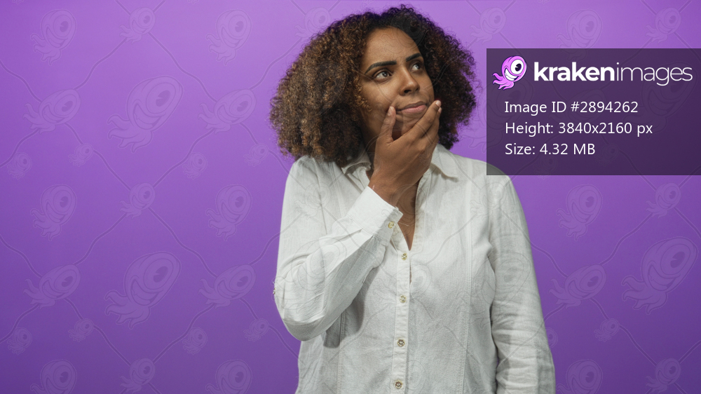 Woman young african american with hand on chin touching cheek in purple studio wearing white shirt looking up; thinking.