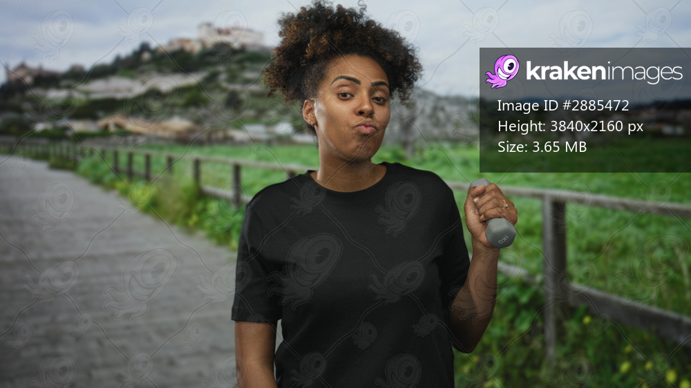 Woman young african american puckers lips while holding gray dumbbell in hand on street boardwalk by green field; confidence fitness wellness strength. - Kraken Images