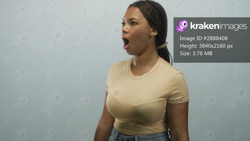 Woman young african american yawning with open mouth and visible chest, braided hair and casual tee in blue studio; tired.