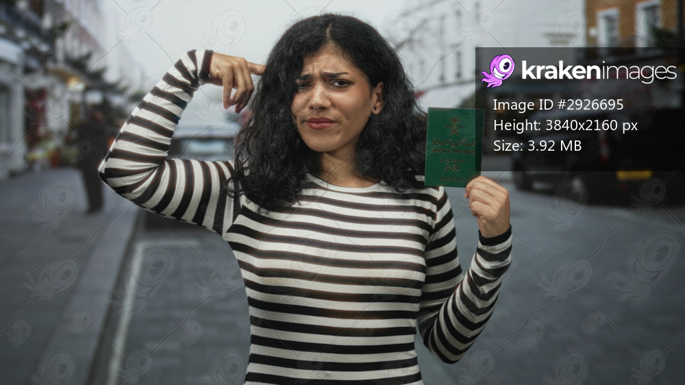 Woman, young arab brunette, holds a saudi passport and points finger to head on street with urban cars and shops visible; immigration frustration.