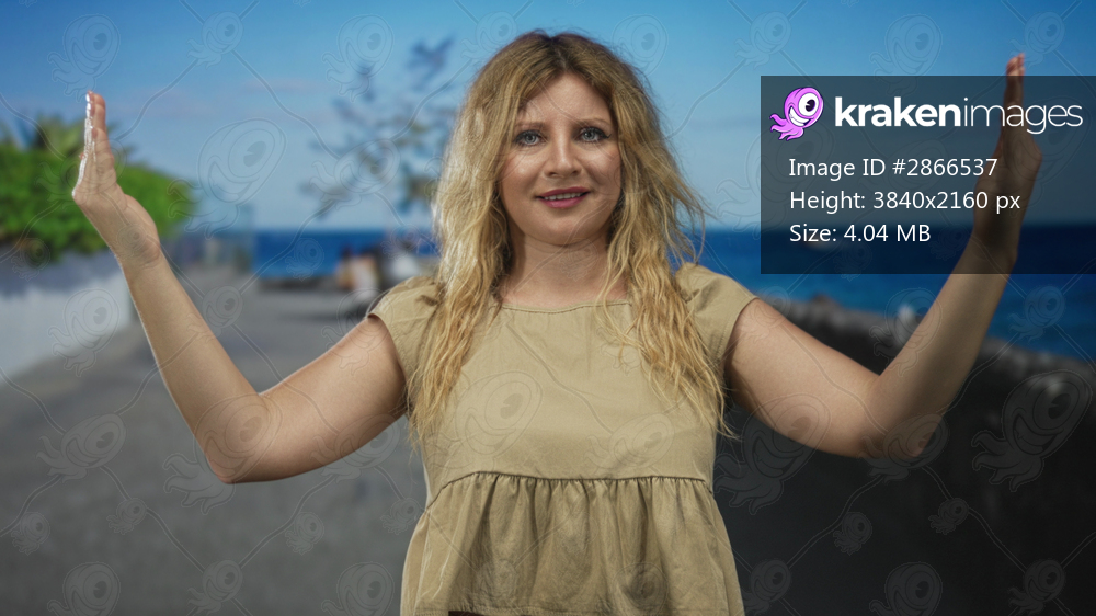 Woman, young blonde, with arms raised palms out on a sunny seaside promenade gesturing to the air while facing forward; quiet contemplation.