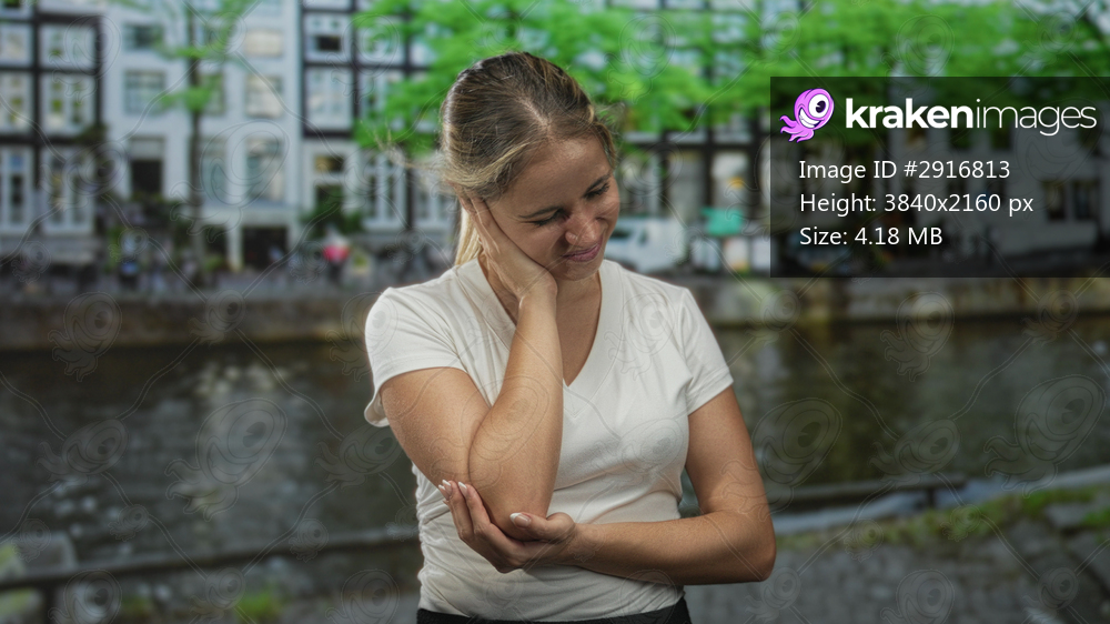 Woman young blonde with hand on cheek holding ear for toothache, squinting by the canal building in amsterdam during daytime; pain.