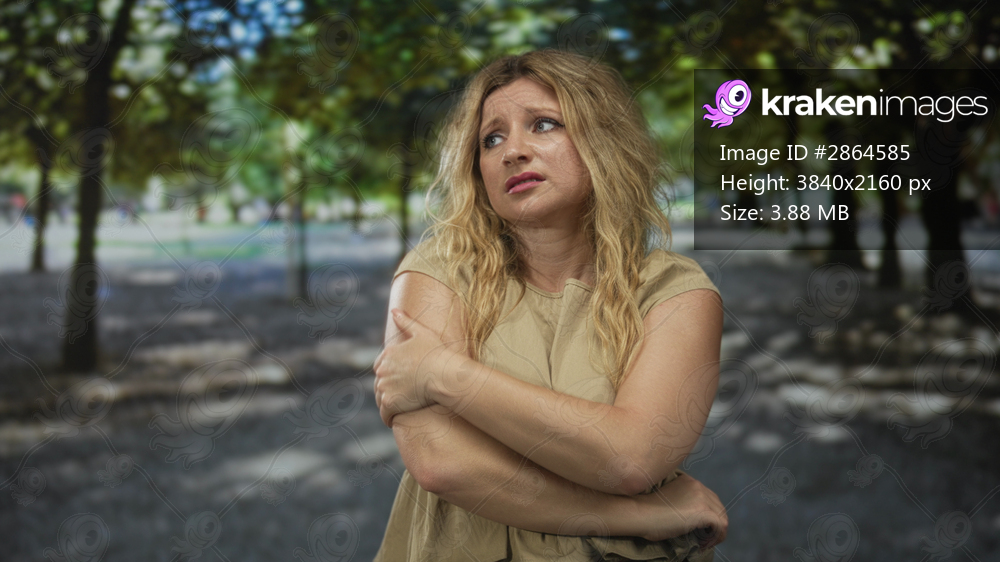 Woman, young blonde, hands on hips standing in forest park among green trees and shaded walking path; frustration.
