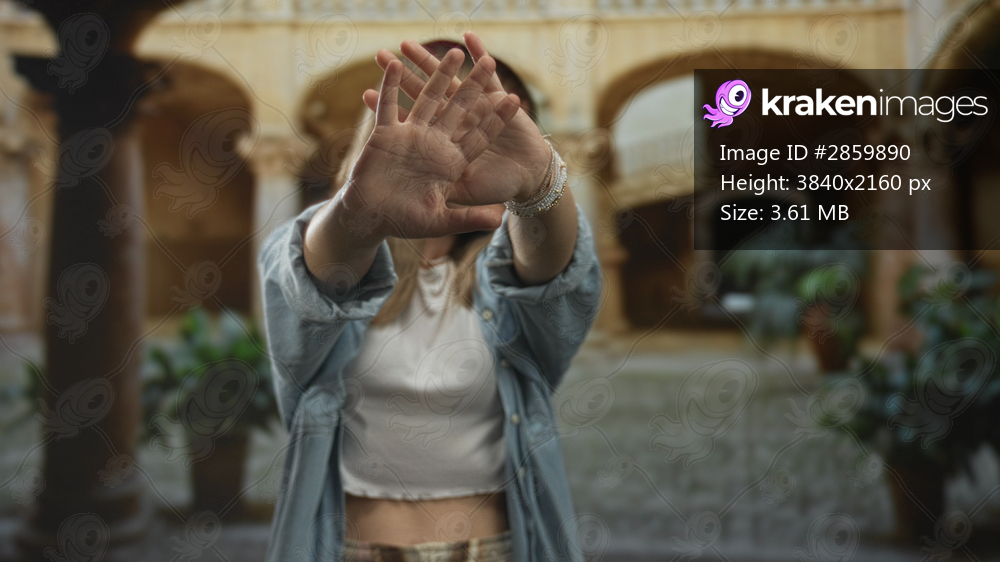 Woman young blonde holding hands up to block face in old building courtyard outdoors; rejection privacy.
