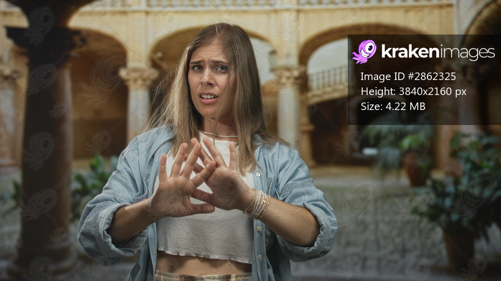 Woman young blonde holding hands up to block face in old building courtyard outdoors; rejection privacy.