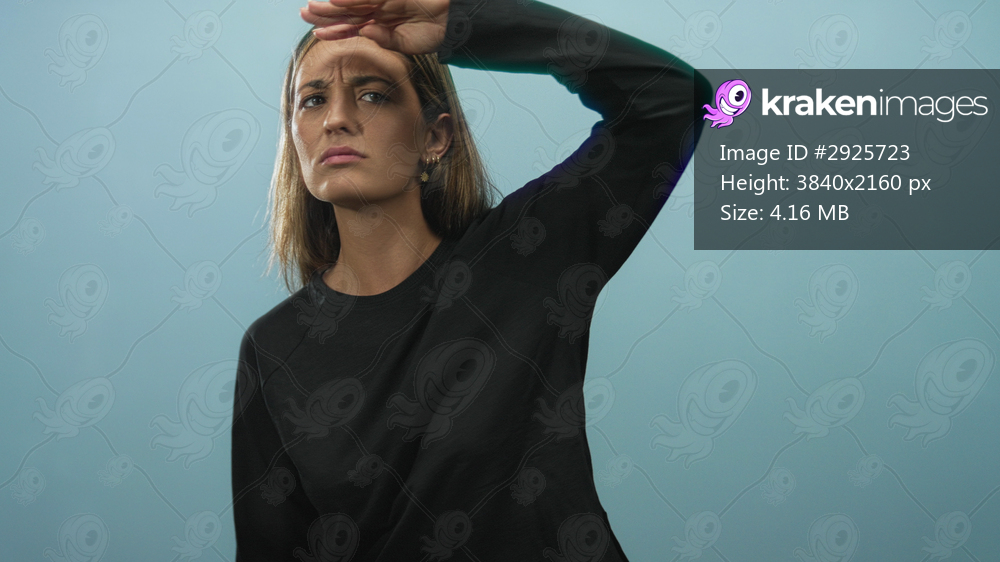 Woman young blonde shielding eyes with hand and squinting while looking into distance in studio against pale blue backdrop; concern.