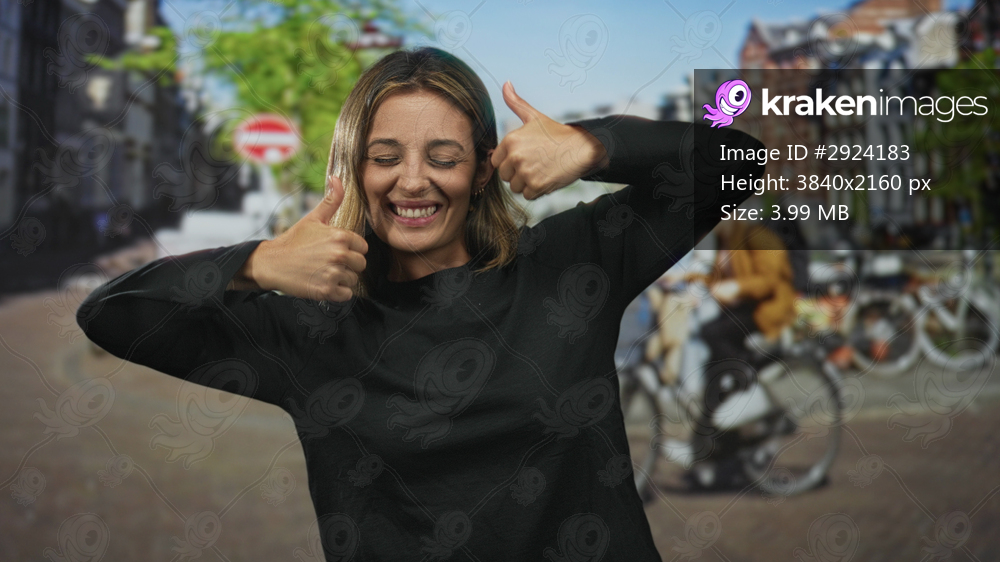 Woman young blonde smiling and giving thumbs up on an amsterdam street with bicycles and canal houses in view; joy.