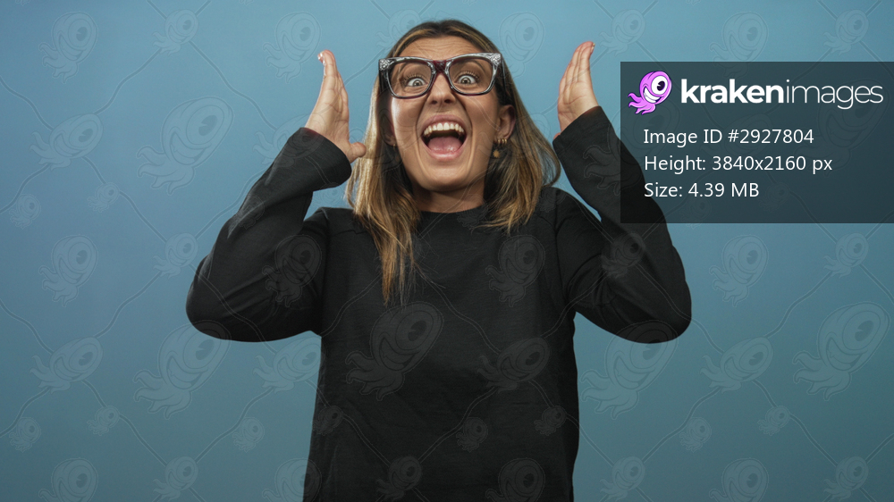Woman young blonde wearing black sweater and glasses with hands raised toward camera in blue studio; joy.