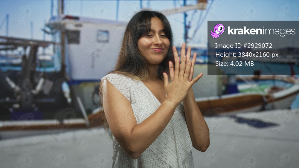 Woman young brunette clasping hands beside moored boats at a port near a street pier, smiling with a lip ring and visible palms; contentment.