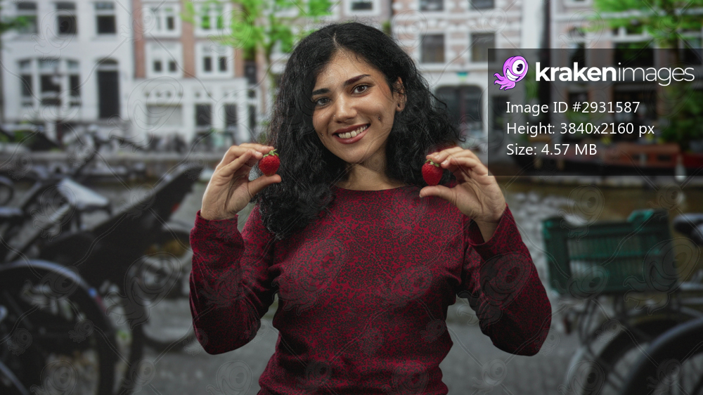 Woman young brunette holding two strawberries with bare hands and smiling on a street in amsterdam; playful joy.