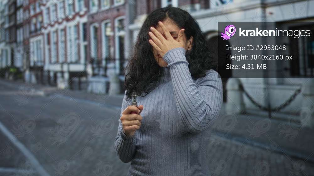 Woman young brunette holding vape device and raising hand to cover face beside an archway and building on a cobbled street; discomfort.