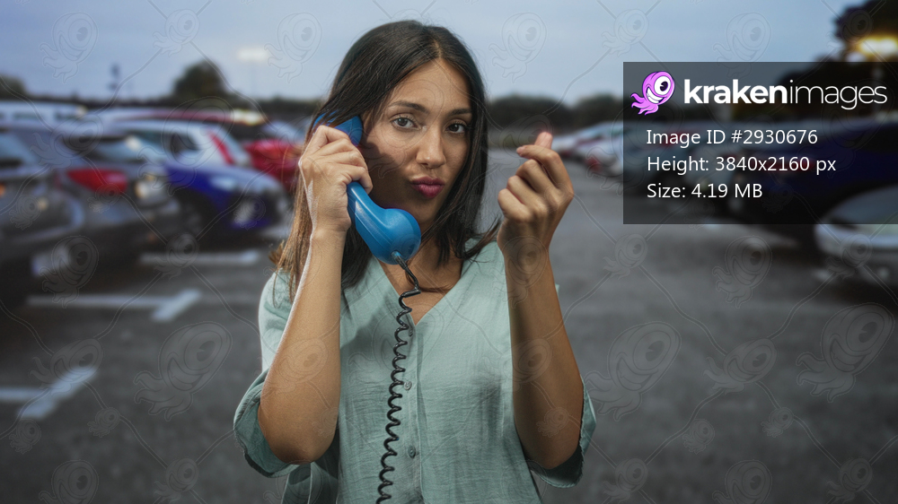 Woman young brunette holds blue handset to ear and clenched fist in street parking lot with cars visible; communication confidence.