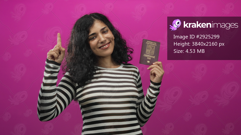 Woman young brunette holds czech passport and points finger up in pink studio wearing striped top and smile; confidence travel identity.