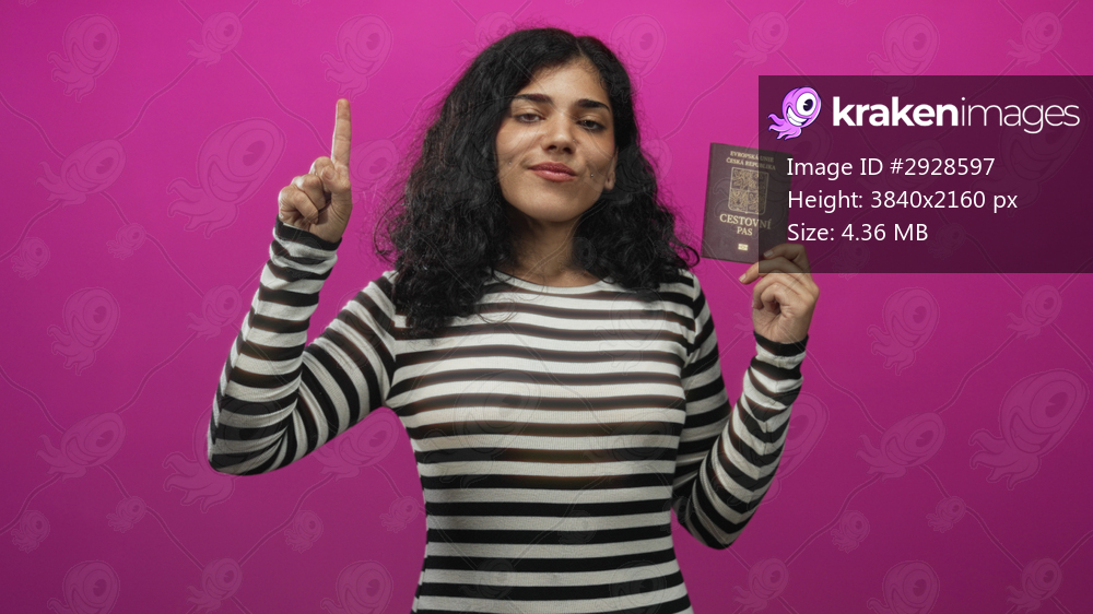 Woman young brunette holds czech passport and points finger up in pink studio wearing striped top and smile; confidence travel identity.