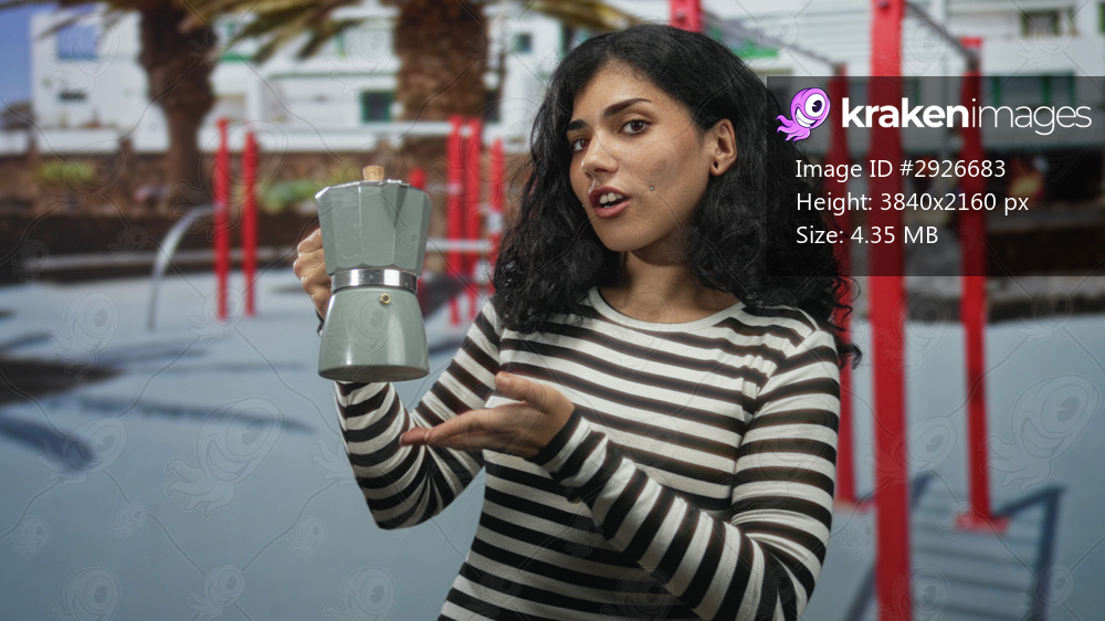 Woman young brunette in black and white striped top holding gray moka coffee maker and pointing finger on street near red outdoor gym bars; confidence invitation. - Kraken Images