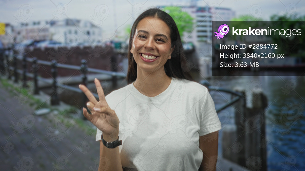 Woman young brunette smiling with thumbs up at a canal street in amsterdam wearing white t shirt and watch; joy approval.