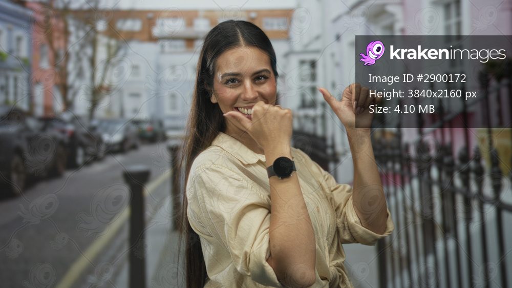 Woman, young brunette, thumbs pointing to self showing smartwatch on wrist on a city street lined with pastel townhouses and parked cars; confidence celebration. - Kraken Images