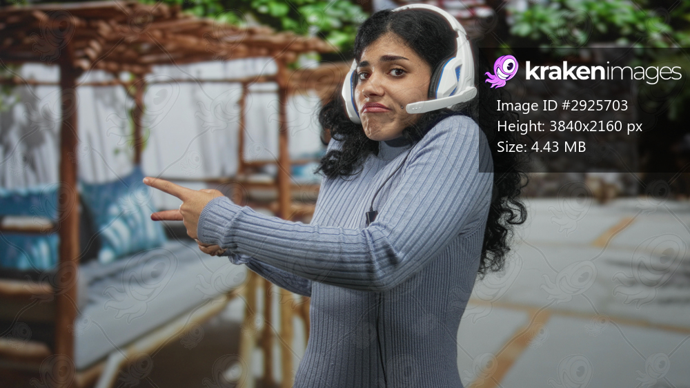 Woman young brunette wearing headset pointing finger on street near outdoor patio seating and pergola; skeptical expression.