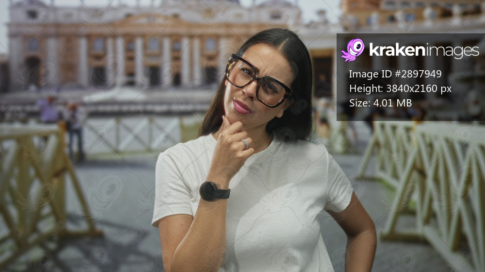 Woman young brunette wearing large tortoiseshell glasses and white tshirt, hand on chin pensive pose in front of building at st peters square vatican; thoughtful curiosity. - Kraken Images