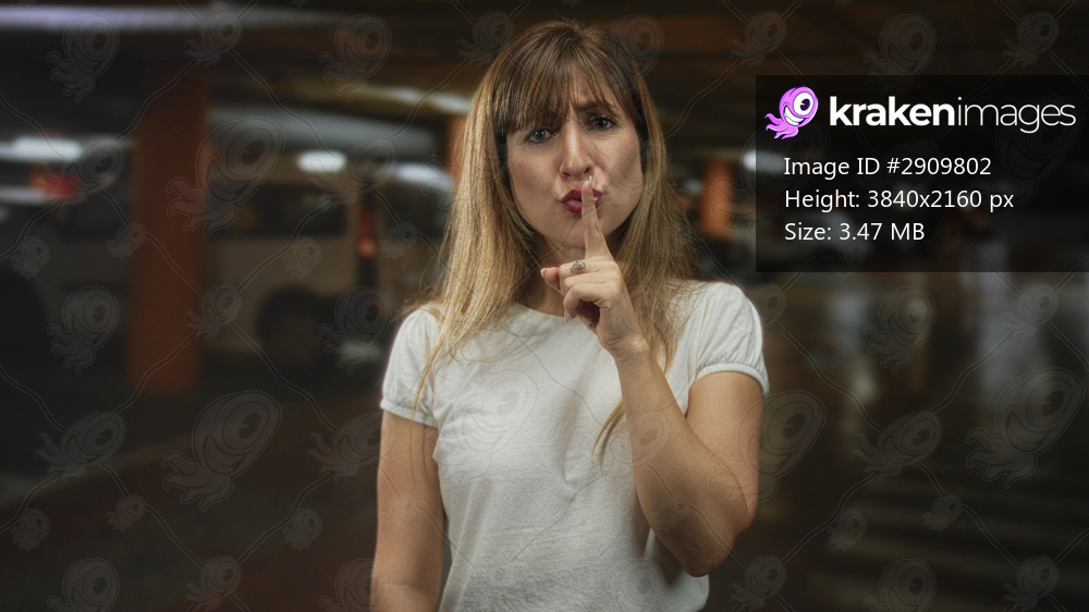 Woman young caucasian with finger to lips for silence in parking building among cars and concrete pillars; secrecy caution alert.