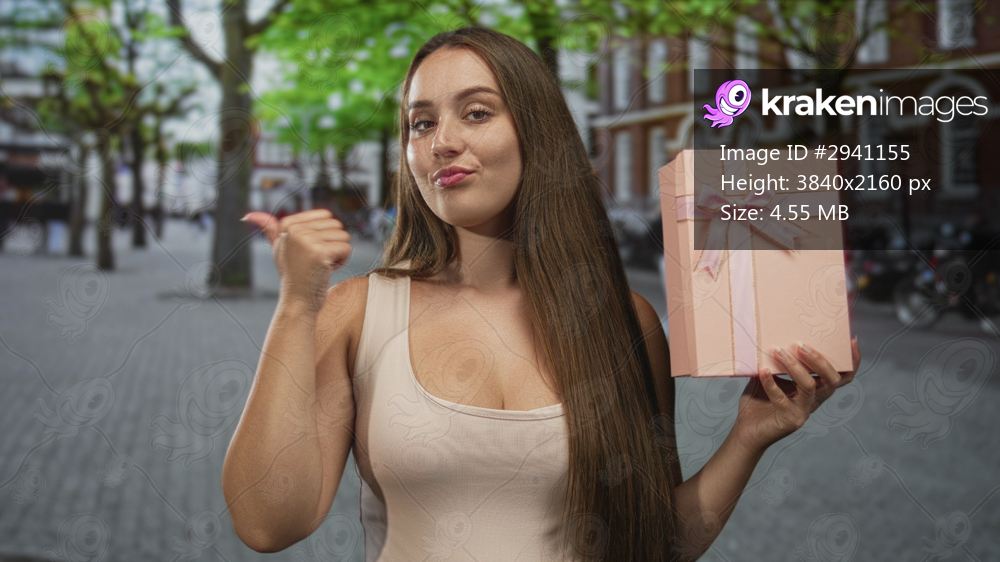 Woman young caucasian holding pink gift box with bow and thumb pointing to box on city street near brick building and trees; surprise giving cheerful.