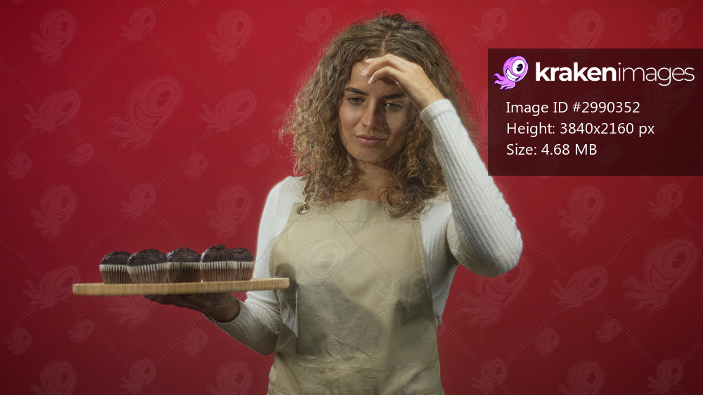 Woman, young with curly hair, wearing an apron, holding a wooden tray of chocolate muffins, hand to forehead gesture in studio; stress resilience.