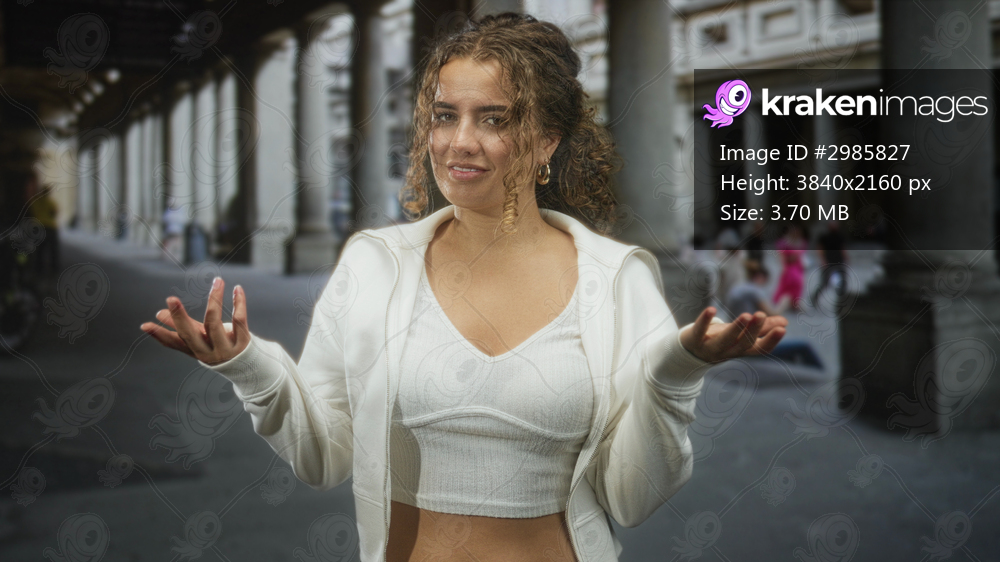Woman young curly hair wearing white crop top and hoodie, bare midriff and bellybutton visible, hands open palms up, smiling while standing by colonnade of building; serenity. - Kraken Images