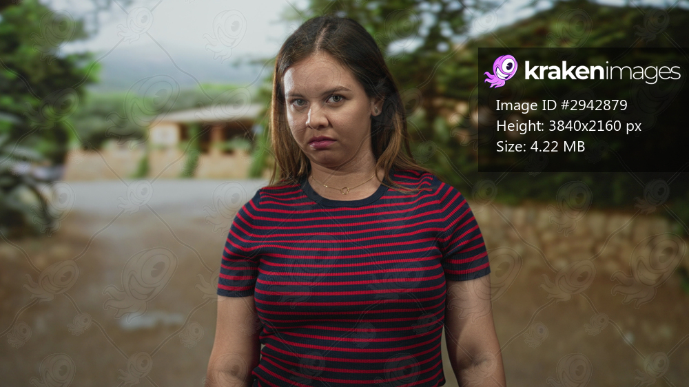 Woman young with eyes closed and head tilted down wearing striped shirt and visible necklace on a street; quiet contemplation.