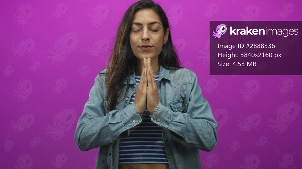 Woman young with hands pressed together in prayer, wearing denim jacket and striped crop top in a studio with purple backdrop; serenity.