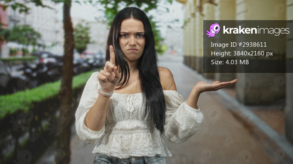 Woman young hispanic beautiful pointing index finger forward with left hand palm up on a city street colonnade; frustration doubt.