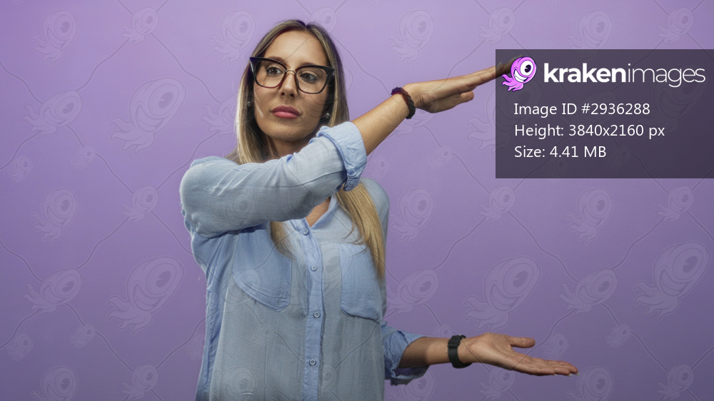 Woman, young hispanic blonde with glasses wearing light blue shirt holds hands apart with palms up and arm raised in purple studio; calm measurement.