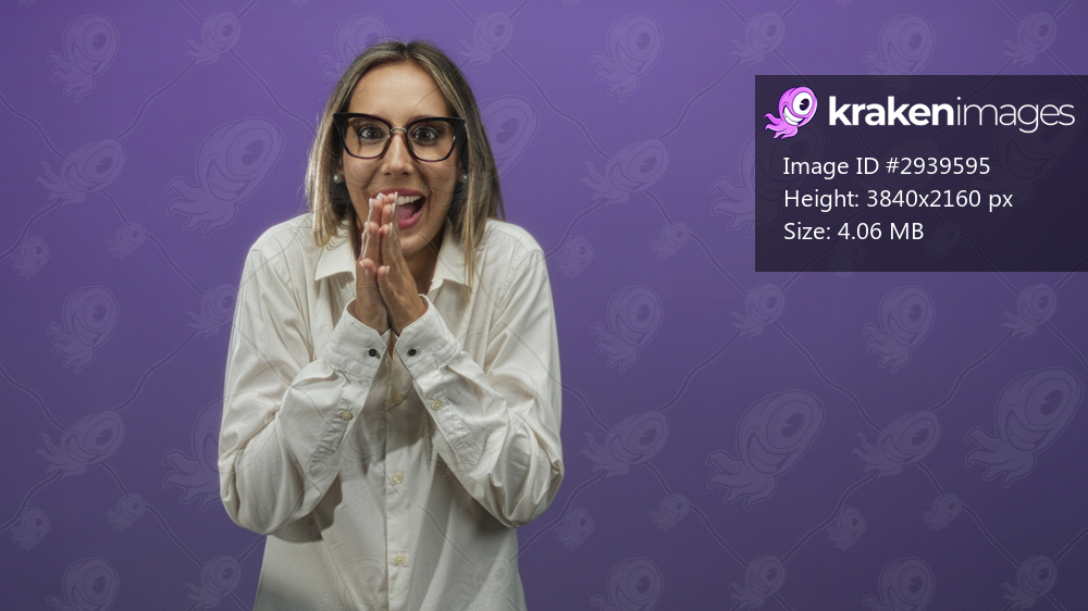 Woman young hispanic blonde wearing glasses and white shirt, hands covering mouth in purple studio; playful surprise.