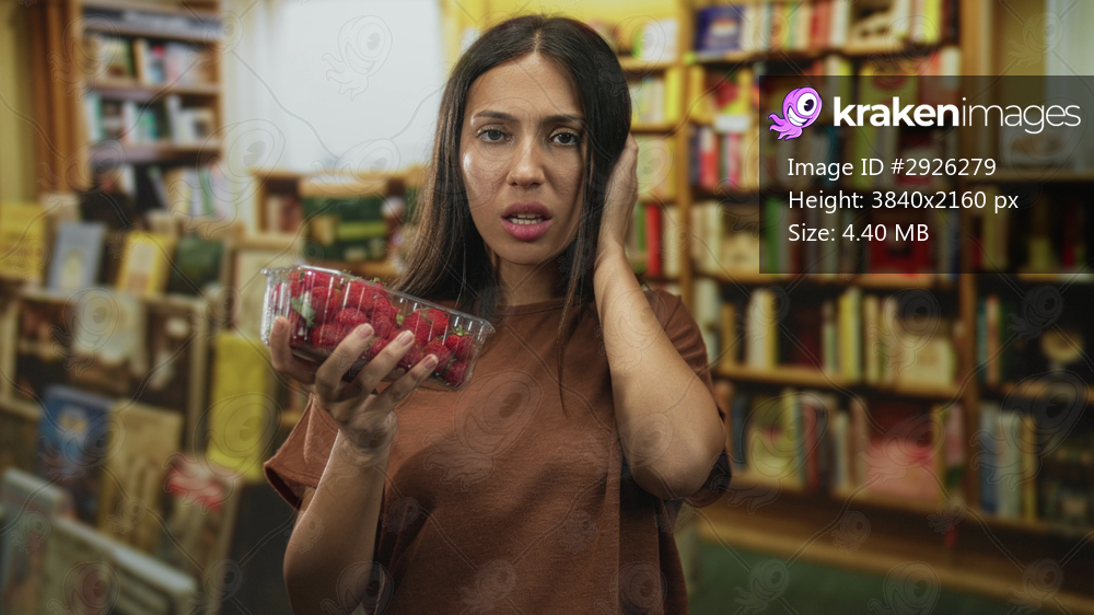 Woman young hispanic brunette holding a plastic punnet of strawberries and sniffing with eyes closed in library; disgust caution.