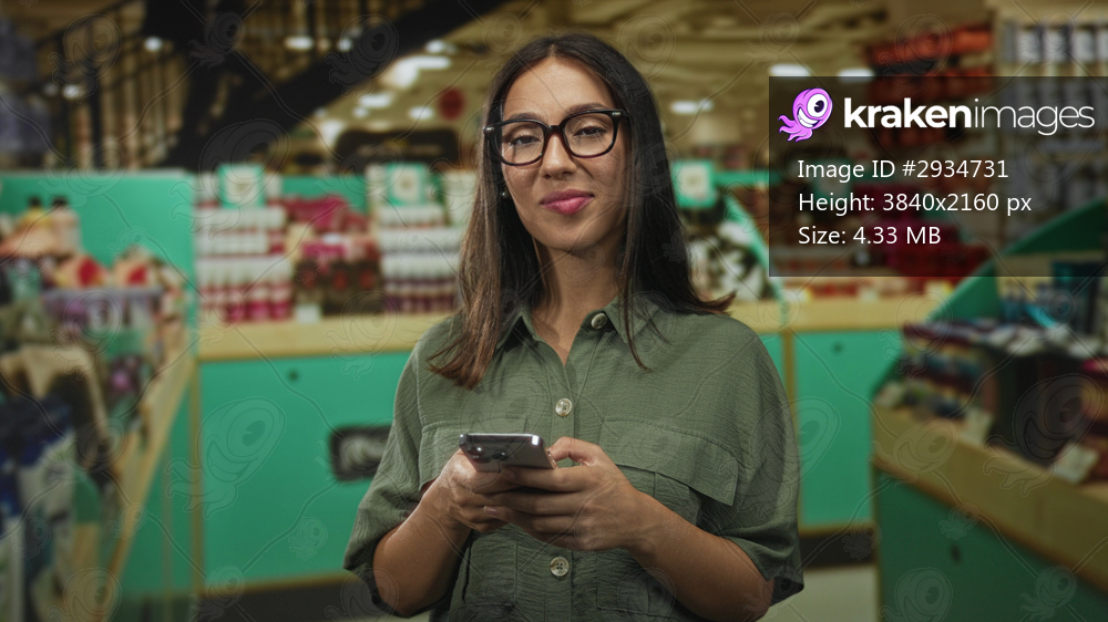 Woman, young hispanic brunette, holding smartphone and texting in a shop aisle while wearing glasses and green shirt; calm focus.
