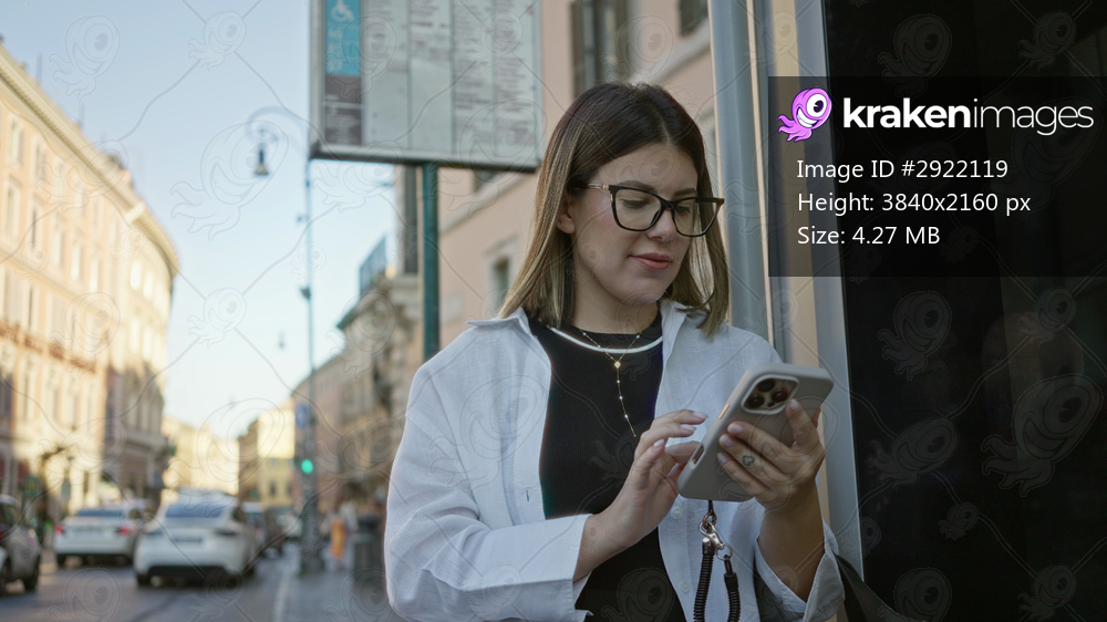 Woman young hispanic brunette tapping smartphone with both hands and visible fingers while standing by a building window on street in rome; focused.