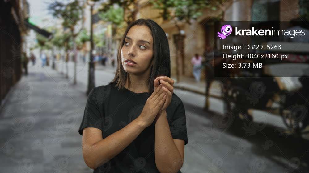 Woman young hispanic clapping hands with a thoughtful gaze on a busy city street beside a horse carriage and storefronts; contemplation.