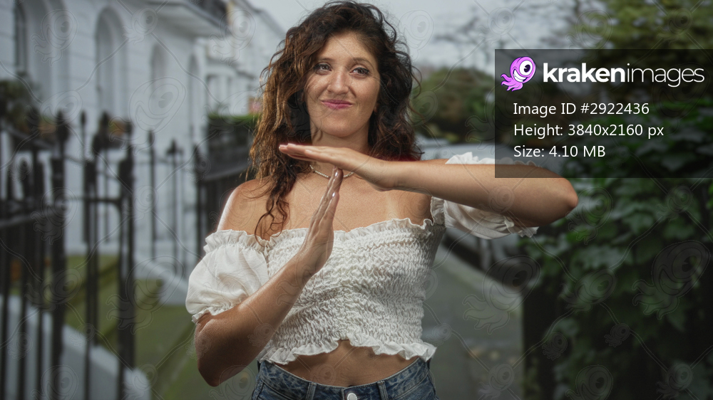 Woman young hispanic forms time out sign with hands while standing on a residential city street near iron railings and houses; confidence empowerment.