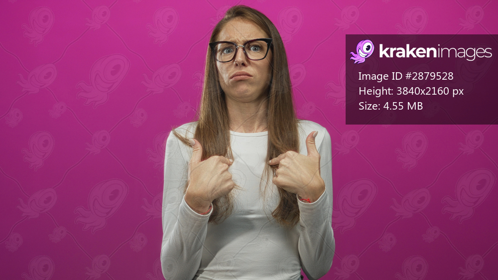Woman young hispanic with glasses pointing both thumbs to her chest in studio with bright pink backdrop; surprised.
