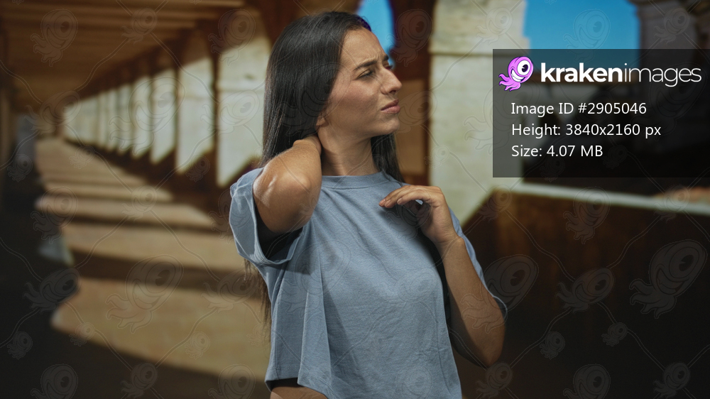 Woman young hispanic holding temples and neck in sunlit old town building colonnade corridor; discomfort reflection.