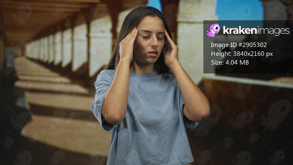 Woman young hispanic holding temples and neck in sunlit old town building colonnade corridor; discomfort reflection.
