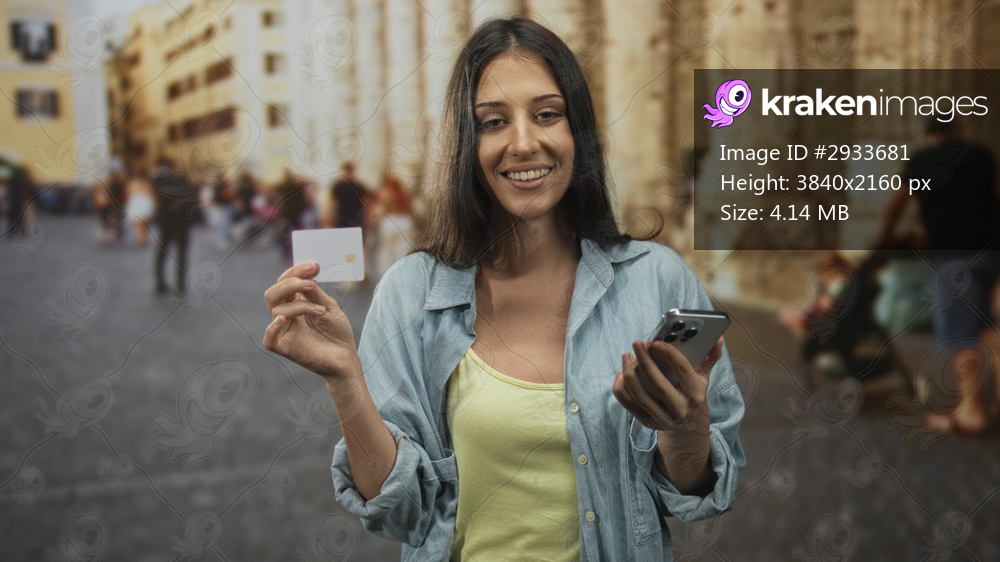 Woman young hispanic holds creditcard and smartphone on an old town street by stone columns, smiling and showing hands and card; confidence.
