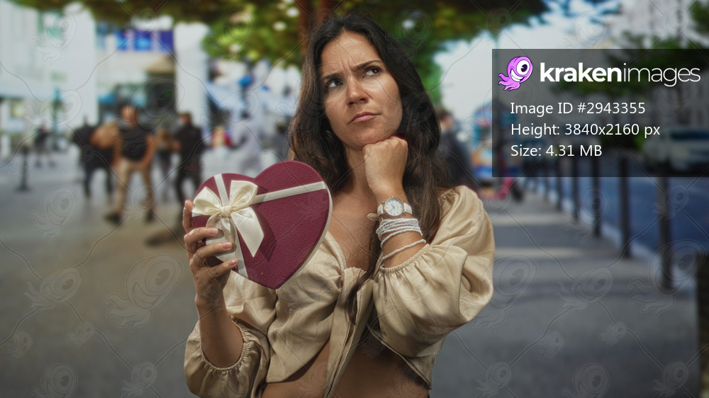 Woman young hispanic holds heart shaped gift box and rests chin on hand on city street amid blurred pedestrians; doubt.